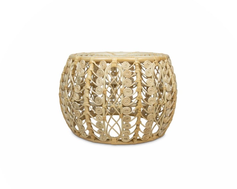 Okrągły stolik kawowy wykonany ręcznie z rattanu. Jego ozdobne boki sprawią, że będzie niezwykle dekoracyjnym i przyciągającym wzrok elementem wyposażenia wnętrza.