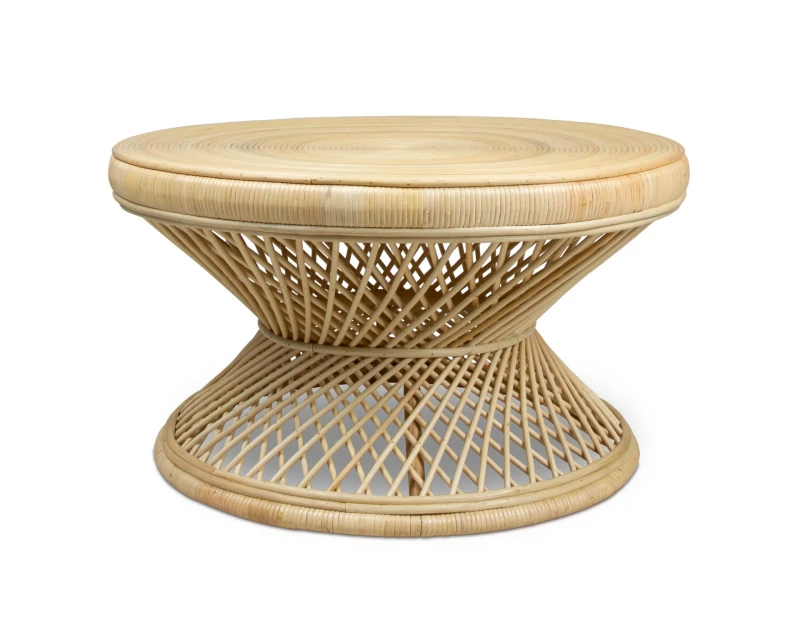 Stolik kawowy wykonany z naturalnego rattanu - elegancja i trwałość.